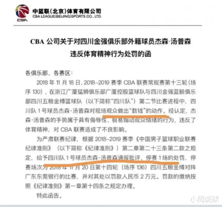 之前CBA就有过多次球员向裁判做数钱动作,然后被追加罚款+禁赛的先例。比如2018-19赛季常规赛第6轮,广东队对阵江苏队的比赛中外援威姆斯向裁判做了这样的动作,被罚款2万元追加禁赛1场;该赛季第13轮,四川队外援杰森-汤普森也在比赛中向裁判做出了这样的数钱动作,被追加禁赛1场和罚款2万元;同样是2018-19赛季,浙江队的外援保罗在对阵广东队的比赛中对裁判做出类似的数钱动作,他也被罚款2万元追加禁赛1场。