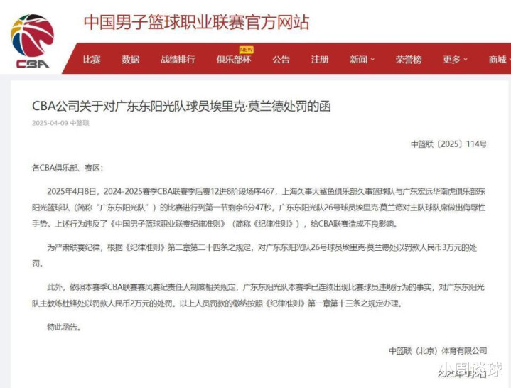 根据CBA官网公示《CBA公司关于对广东东阳光队球员埃里克-莫兰德处罚的函》,内容显示在4月8日晚上的比赛,第一节剩余6分47秒,广东队球员莫兰德对主队球员席做出侮辱性的手势,该行为违反了联赛的纪律准则,给CBA造成了不良影响,根据第二章第二十四条规定,对莫兰德处以罚款3万元人民币的处罚;因为本赛季广东队连续多次出现球员违规行为,所以主教练杜锋被追加处罚2万元。